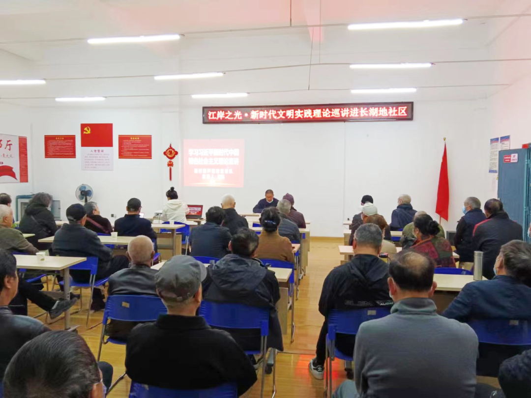 新村街道“新村新声”宣讲队走入长湖地社区开展新时代文明实践理论巡讲活动。宣讲队成员胡伟围绕学习贯彻习近平生态文明思想,以“坚持人与自然和谐共生”为主题,向长湖地社区居民以及党员志愿者分享心得体会,推动形成绿色发展方式和生活方式。