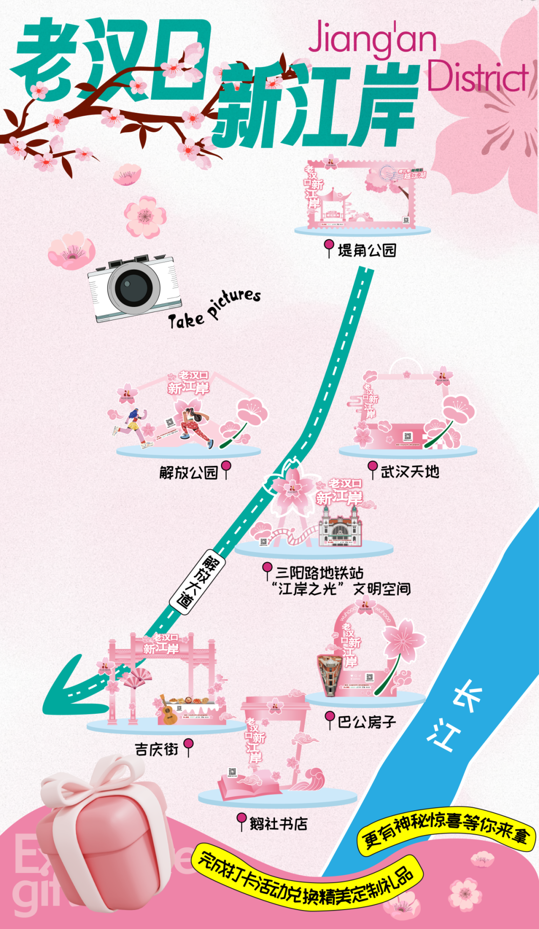 三月底至五月初,漫游三阳路地铁站“江岸之光”文明空间、巴公房子、鹅社书店、解放公园、武汉天地、吉庆街、堤角公园等江岸文旅地标,完成打卡活动,即有机会获得价值超过500元的神秘“锦鲤大礼包”!