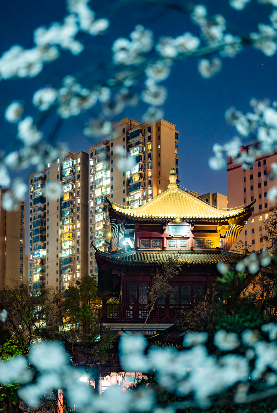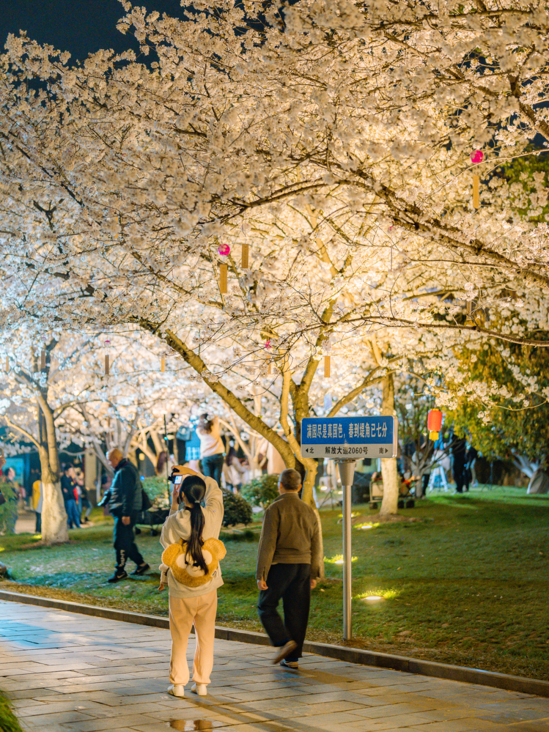 灯光透过花簇间的缝隙,投下斑驳的光影,让樱花的美更为立体。