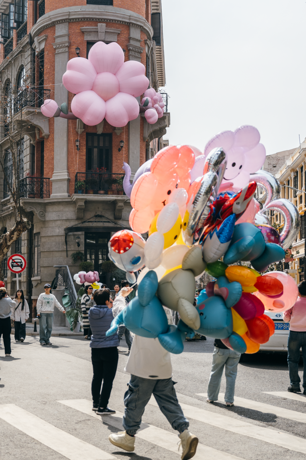 在巴公房子的主题装置前,孩童手中的卡通气球飘飘然,与“樱花”一道演绎着绵绵的春意,百年老建筑依旧屹立,三者共同谱写着关于时光与活力的华丽乐章。