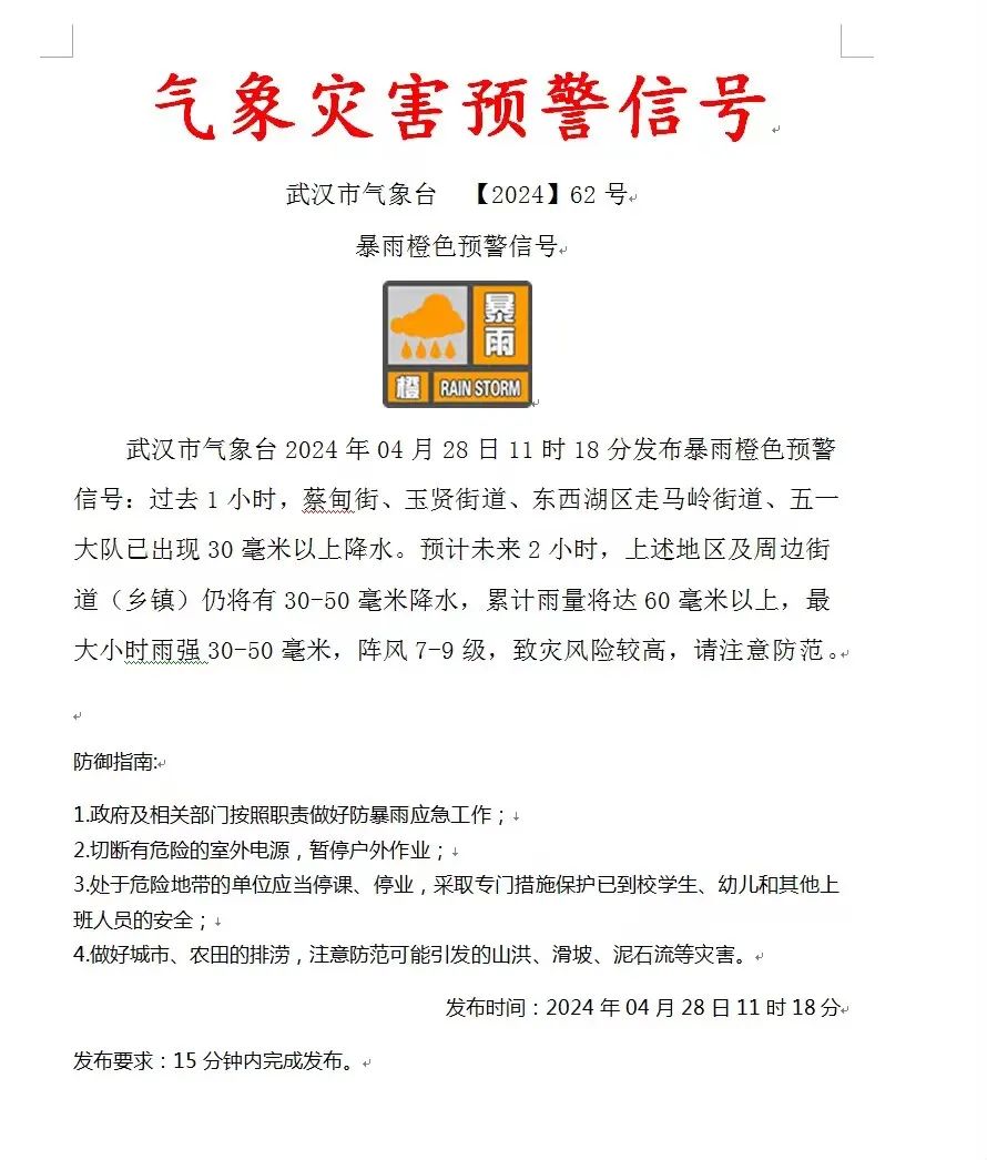 过去1小时,蔡甸街、玉贤街道、东西湖区走马岭街道、五一大队已出现30毫米以上降水。预计未来2小时,上述地区及周边街道(乡镇)仍将有30-50毫米降水,累计雨量将达60毫米以上,最大小时雨强30-50毫米,阵风7-9级,致灾风险较高,请注意防范。