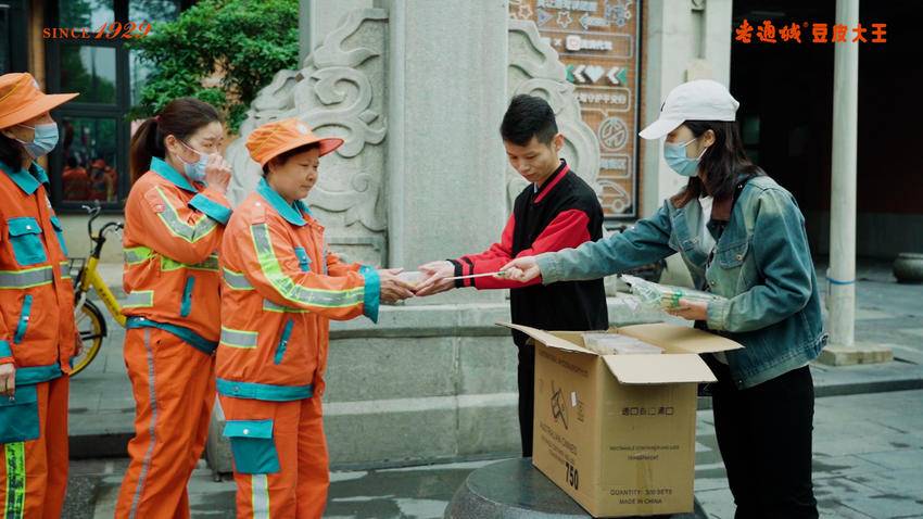 活动当天,老通城豆皮大王的工作人员将一盒盒热腾腾的豆皮送到了环卫工人和大智街道社区志愿者的手中,表达对一线工作者辛勤付出的认可与感谢。