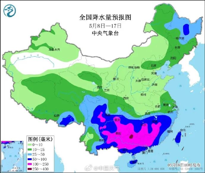 预计5月中旬,南方多降雨过程,主要出现在5月10日至12日、14日至15日、17日前后。其中10日至12日,贵州中东部、江南、华南中北部等地自西向东、自北向南先后有大到暴雨,湖南中南部、江西中南部、福建西部等地的部分地区有大暴雨。上述地区累计降雨量40~80毫米,部分地区100~150毫米,局地超过200毫米。过程伴有短时强降雨,最大小时降雨量20~50毫米,局地可达70毫米,最强降雨时段出现在10日夜间至11日。