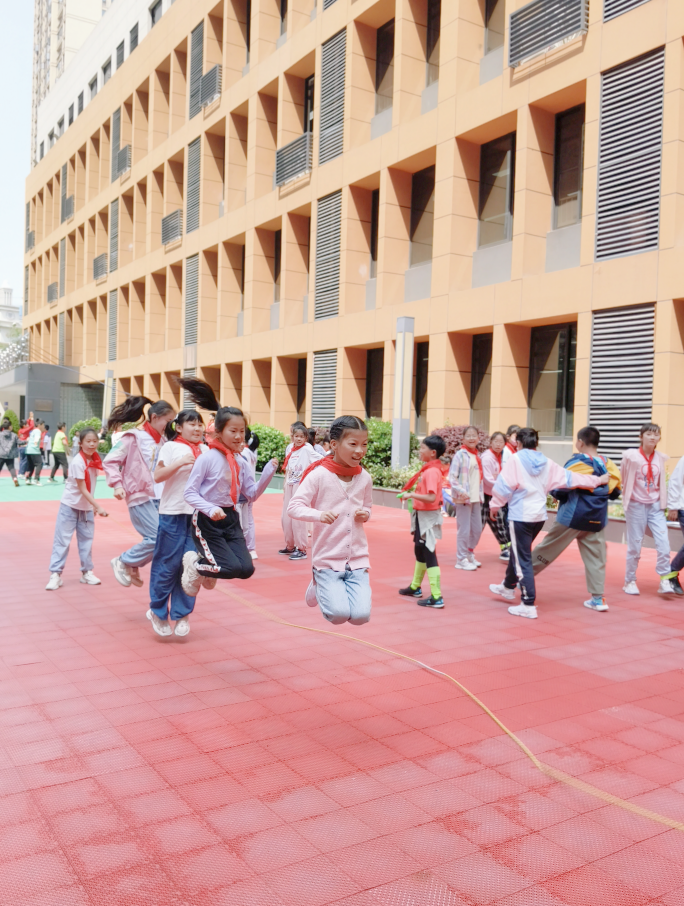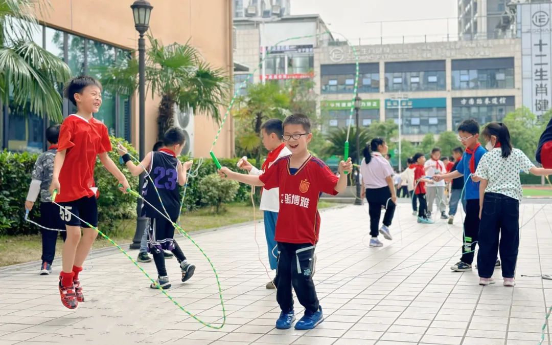 并脚跳、开合跳、弓步跳、滑雪跳、后屈腿跳……每天,当大课间的音乐响起,江岸区新建小学的操场上一片欢腾。全校同学走出教室,手执彩绳,踏着音乐的节拍,做起花式跳绳操,尽情展示花样跳法。各班级还利用跳绳设计了趣味横生的体育游戏,如跳绳接力跑、跳长绳、“绳子迷宫”“穿越火线”等。一根小小的跳绳成了“百变神器”,成了学生们快乐的源泉。