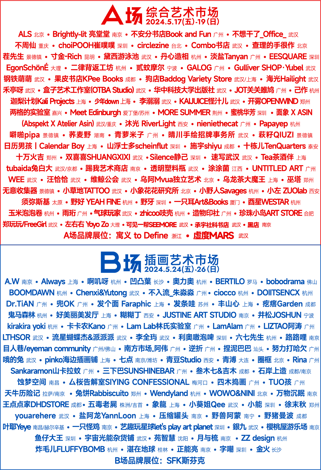 WHAB艺术“超级市场”将以A/B场活动形式呈现,5月17日-19日是综合艺术市场,5月24-26为插画艺术市场。Combo书店、黛西游泳池、狗店Baddog Variety Store、小草地TATOO等老朋友都在出席名单上,另外还有一众新朋友和大家见面。