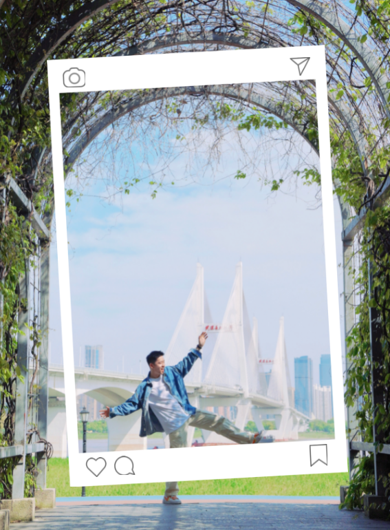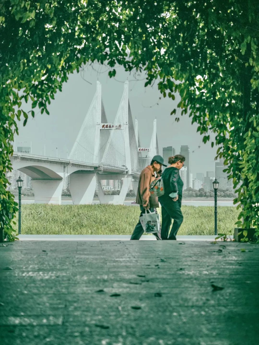 这里是一处由藤树形成的小绿道,以绿道的拱门为前景,以不远处的长江二桥为背景,犹如将拱门的另一端搭成一个小型T台,看过往的路人上演一幕幕生活的独播剧场。