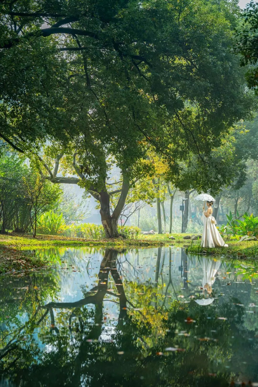 顺着梧桐大道往前走,有一汪浅浅的小潭,郁郁葱葱的树木环绕其间,高大繁茂。