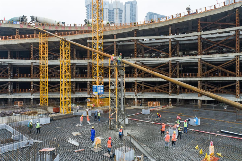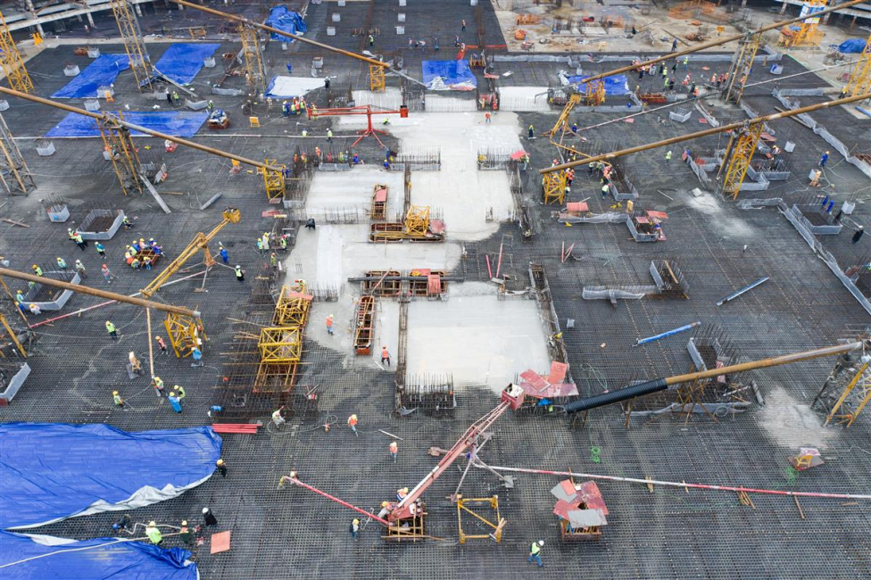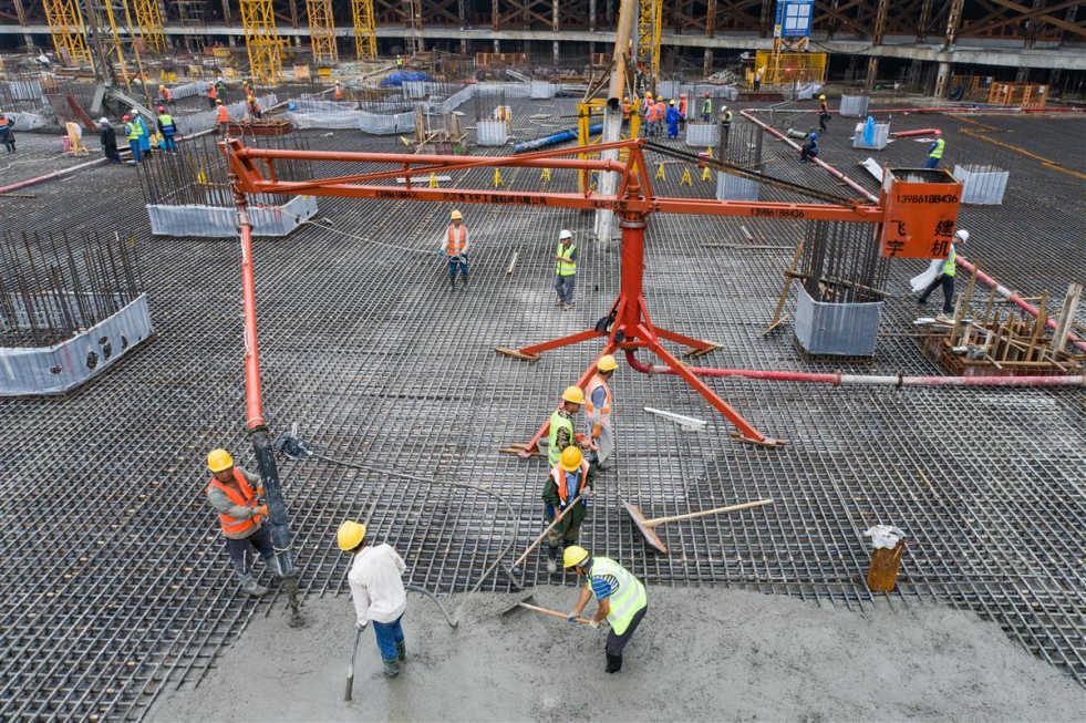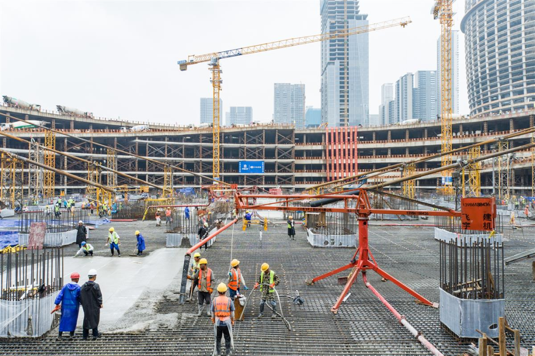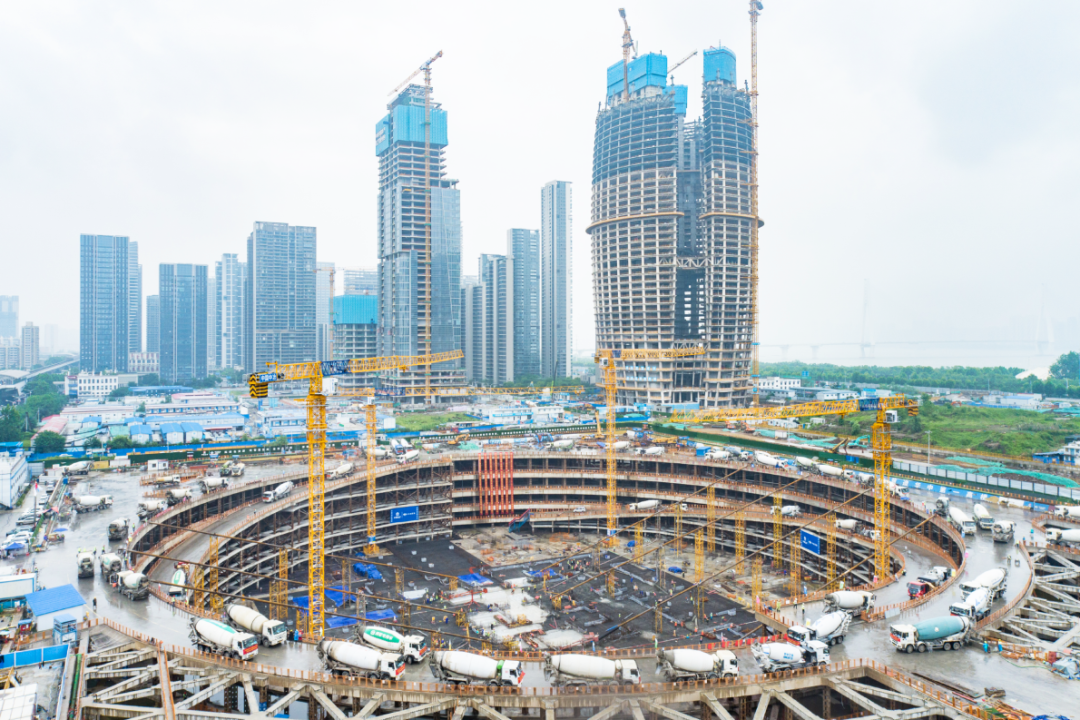 作为建筑主体结构的一道工序,武汉周大福金融中心筏板工程要浇筑约11万方的混凝土,而本次最大筏板混凝土浇筑体量达到近4.3万方,相当于好几栋楼房的混凝土总量,需要连续浇筑四天,每天1100至1200台次水泥搅拌车不间断作业。