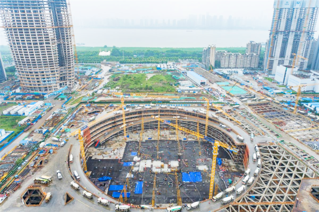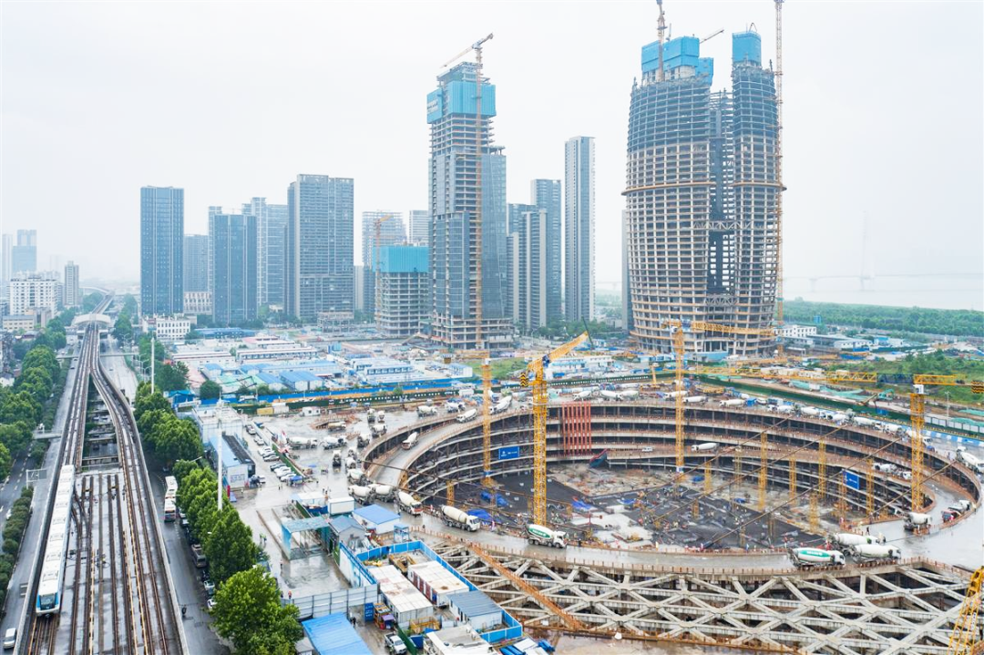 5月27日,航拍武汉周大福金融中心主塔楼最大筏板浇筑作业现场,一辆接一辆的水泥搅拌车沿着基坑“圆盘”周围首尾相连,不间断地将水泥输送至基坑底部。