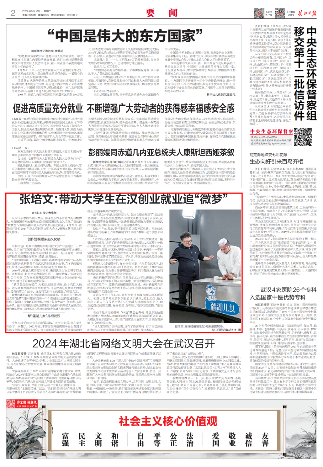 从来汉求学的外地大学生,到现在业界小有名气的自媒体人,来自新疆哈密的张培文通过短剧《疆湖儿女》,实现了自己的“微梦想”:帮助新疆年轻人在汉扎根,创业就业。5月28日,在2024年湖北省网络文明大会上,张培文获评湖北好网民榜样。