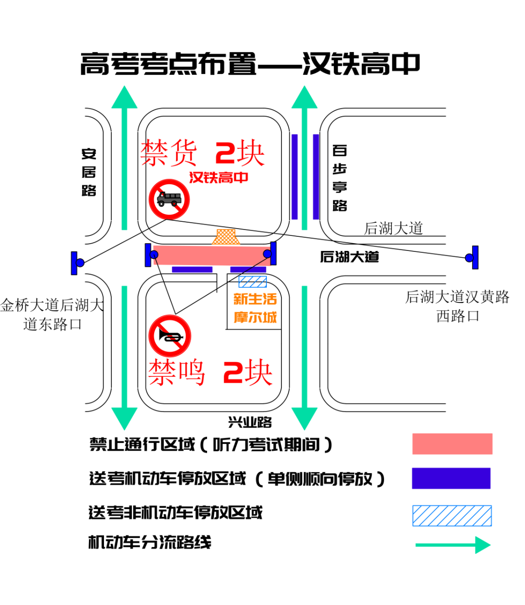 后湖大道(安居路至百步亭路)听力期间禁止通行,建议绕行安居路、百步亭路、兴业路、后湖南路。后湖大道塔子湖西路口、后湖大道塔子湖东路口需按指示标牌绕行。