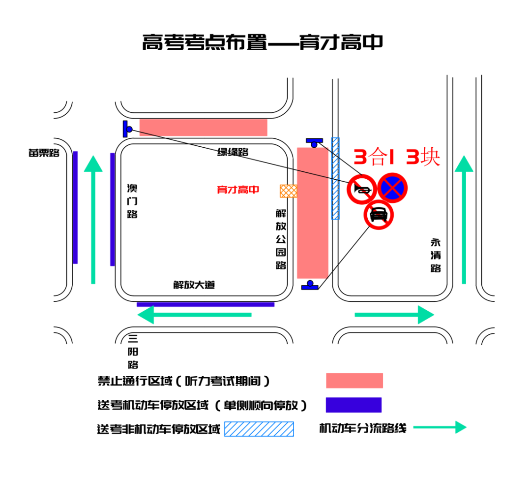 解放公园路(绿缘路至解放大道)、绿缘路(澳门路至解放公园路)听力期间禁止通行,建议绕行永清路、澳门路、解放大道;绿缘路澳门路口禁停、禁鸣、禁行。