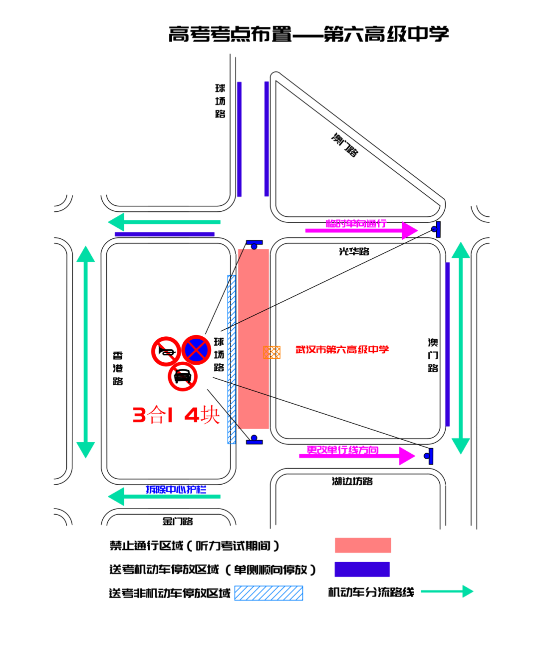 球场路(光华路至湖边坊路)每日考前十分钟至考试结束禁止通行,建议绕行澳门路、香港路、光华路、金门路;光华路(澳门路至球场路)、湖边坊路(澳门路至球场路)临时改为自西向东单向通行;湖边坊路澳门路口、光华路澳门路口禁停、禁鸣、禁行。
