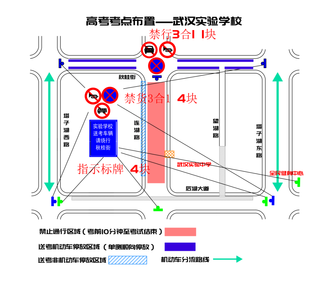 连湖路(秋桂街至后湖大道)每日考前十分钟至考试结束禁止通行,建议按指示标牌绕行塔子湖东路、塔子湖西路。