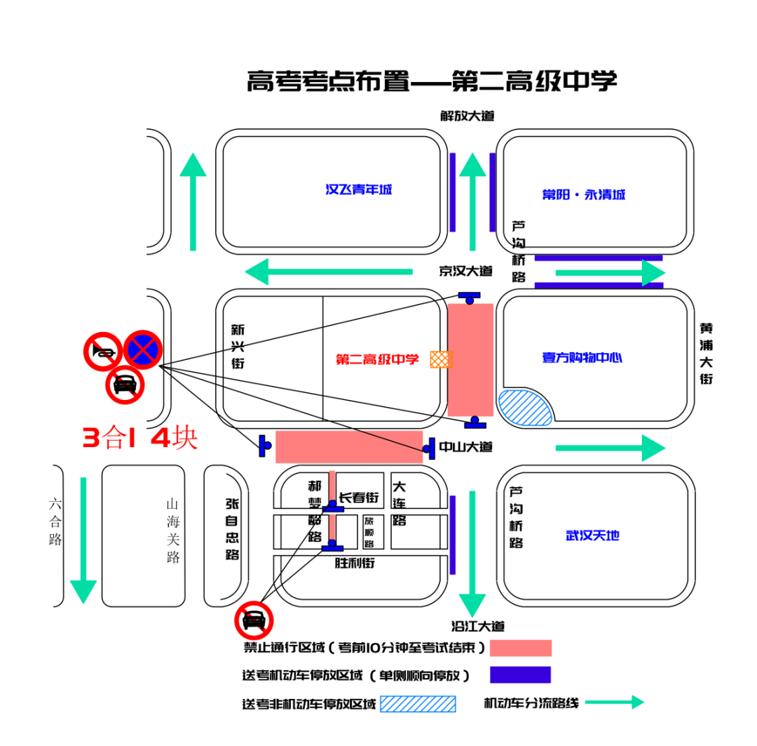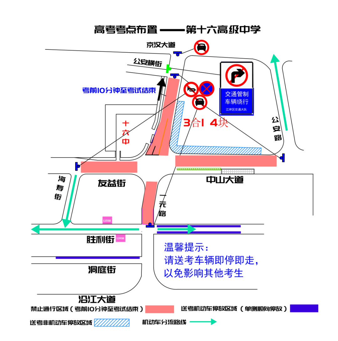 一元路(公安横街至胜利街)、中山大道(海寿街至公安路)每日考前十分钟至考试结束禁止通行,建议绕行京汉大道、沿江大道、胜利街、公安路;一元路胜利街路口、中山大道海寿街口禁停、禁鸣、禁行。