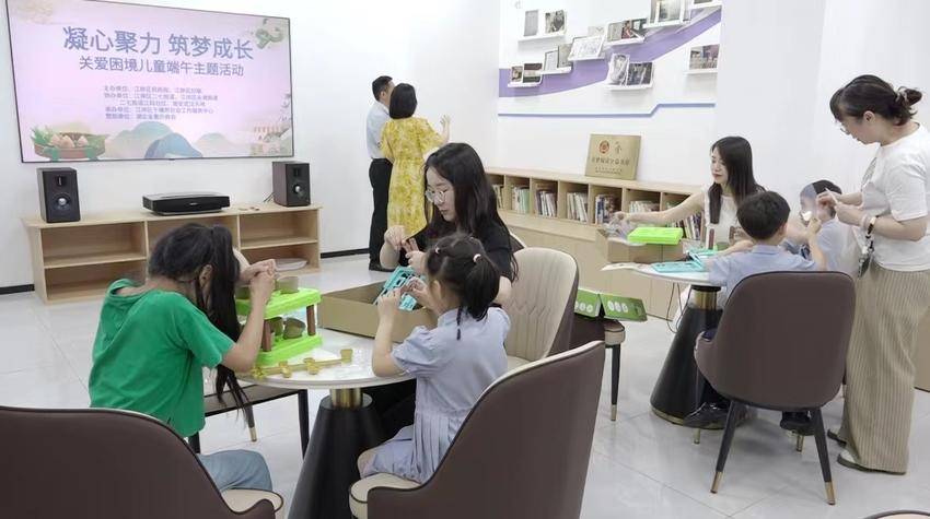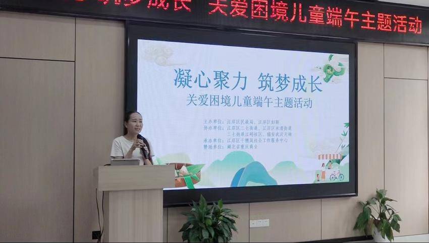 6月6日下午,江岸区民政局联合江岸区妇联、江岸区二七街道、江岸区永清街道、二七街道江码社区、瑞安武汉天地、江岸区千穂岚社会工作服务中心举办了“凝心聚力 筑梦成长”关爱困境儿童端午主题活动。市民政局、区民政局、区妇联等相关负责人、湖北省重庆商会代表及困境儿童家庭代表等参加了活动。
