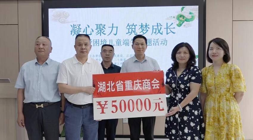 在当天的活动中,湖北省重庆商会对江岸区困境儿童关爱工作捐赠了5万元资金,并与市、区民政局相关负责人一起为困境儿童送上了节日的关怀和祝福。