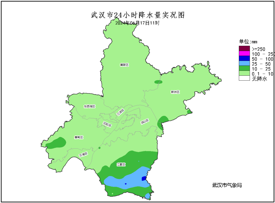 昨天傍晚到上半夜我市大部出现分散性雷阵雨天气,局地伴有短时强降水和雷暴大风,其中江夏南部中到大雨,局地暴雨。最大累计雨量为江夏区舒安站74.8毫米,最大小时雨强为江夏区山坡光星站40.7毫米(出现时间16日20-21时),最大阵风为新洲区大屋冲站17.4m/s(8级,出现时间16日17时34分)。昨天最低气温25.3℃,最高气温35℃。今天早晨我市多云,最低气温24.8℃。