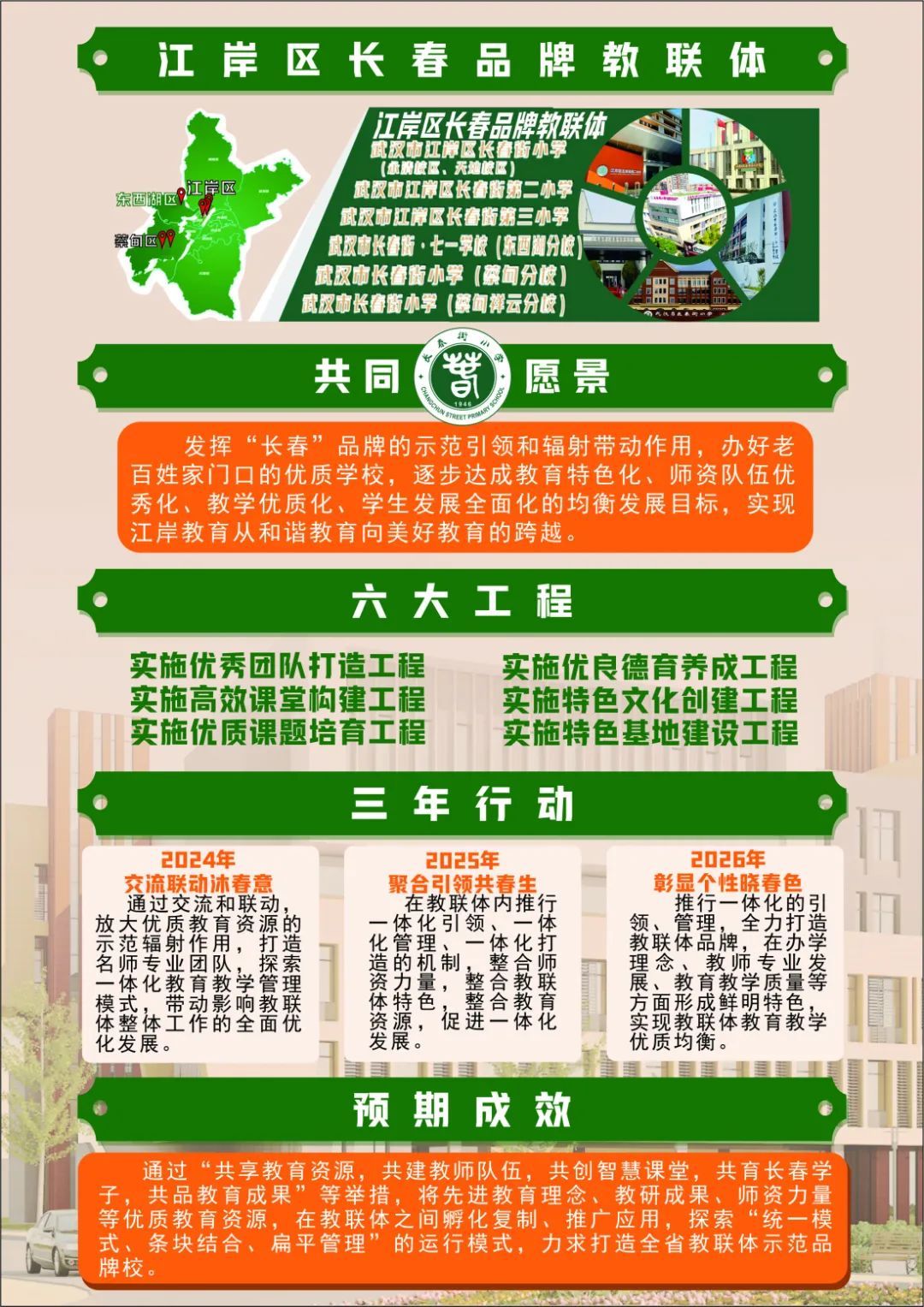 江岸区44所小学100%纳入教联体建设。自2023年推进教联体建设以来,武汉市长春品牌教联体、育二“同成”教联体、博雅品牌教联体被评为市级教联体,教联体建设促进了全区义务教育优质均衡发展水平,人民群众对教育的满意度明显提升。