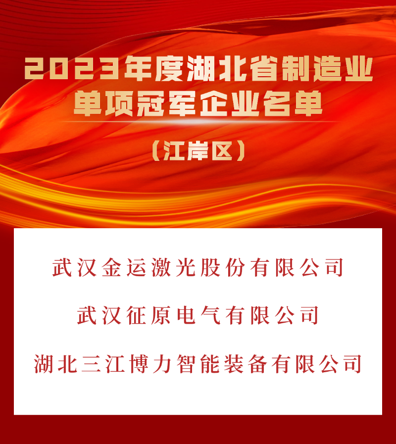 近日,在湖北省经信厅公布的2023年度湖北省制造业单项冠军企业名单中,江岸区3家企业榜上有名。
