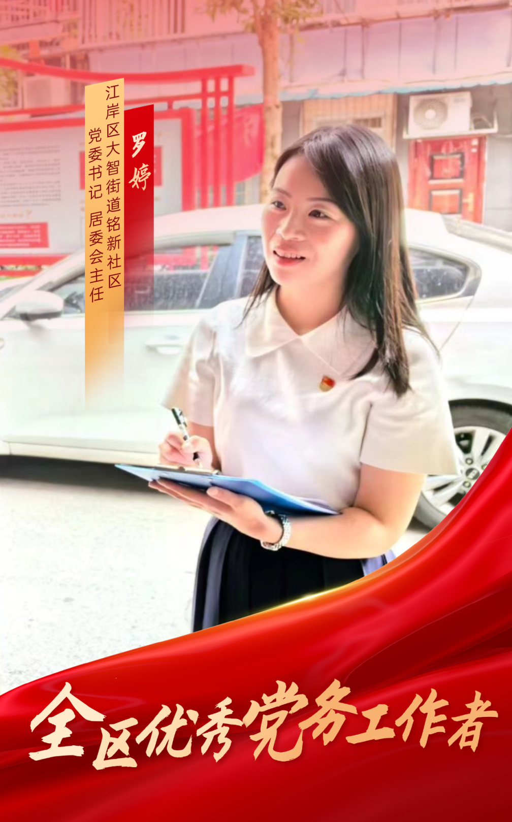 她担任铭新社区党委书记以来,坚持党建引领,联动下沉单位和共建单位,成立辖区“商户联盟”,凝聚共建力量。通过“亮身份组团队”,激发党员活力,组建志愿服务队23支,关爱“一老一小”和特殊群体,开展惠民活动87次。搭建议事平台,践行“五共”理念,围绕居民需求,完成共同缔造项目32个,使交易四巷、铭新巷等老旧小区焕然一新。深化“精网实格”, 创新使用“七色工作法”,及时发现就地化解居民矛盾,上门调解矛盾纠纷378次。2023年6月被江岸区委组织部评为“江岸区社区书记能力竞赛二等奖”。