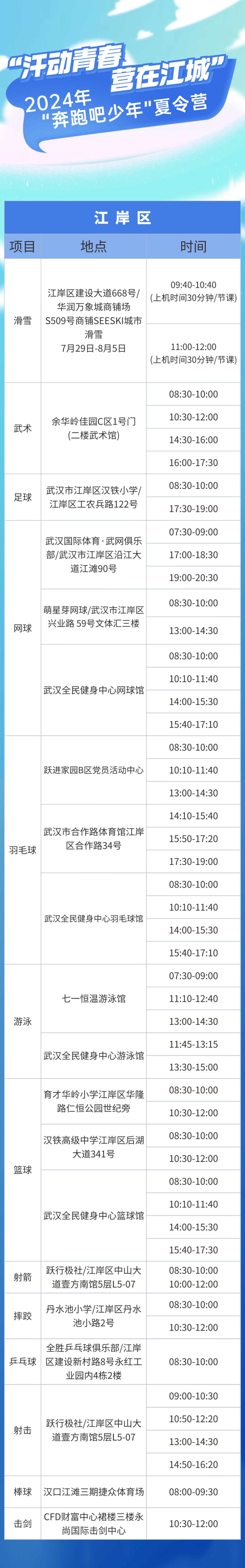 2024年7月27日—8月7日(共12天,冰雪项目为8天,部分项目培训时间有所调整),详情可登录武汉市体育局官网或“武汉智慧体育服务平台”官方微信公众号查询。