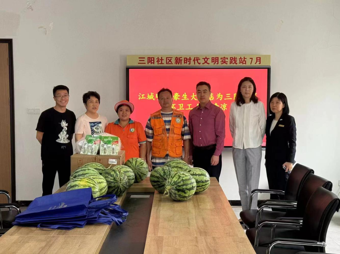 一元街道三阳社区联合辖区共建单位开展一系列夏季送清凉慰问活动,为参与社区防汛值守的党员志愿者,送去藿香正气口服液等防暑药品与饮品,为社区环卫工人送去西瓜等防暑物资,并向大家普及高温防护、中暑急救等知识,把清凉和关爱送到群众身边。