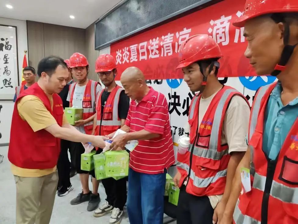 花桥街道联合三村社区笑颜志愿者服务队开展“炎炎夏日送清凉 滴滴关怀沁人心”廉政送清凉活动,为辖区内华天集团K13建筑工地坚守一线的建筑工人们送上花露水、毛巾、饮料等“清凉大礼包”。
