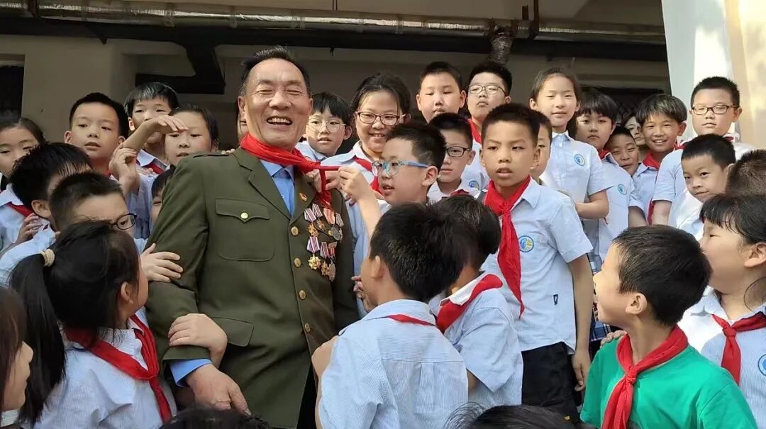 孩子们听完李明龙的分享,总会围在他身旁,小心地触摸那一个个金灿灿的奖章,并给他佩戴上鲜艳的红领巾。