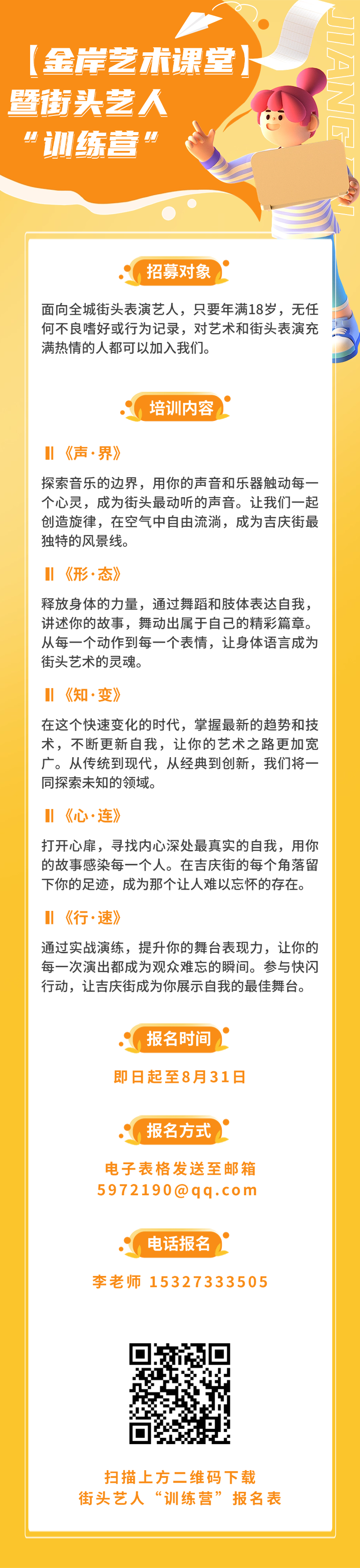 为弘扬街头文化,传承民间艺术,江岸区举办【金岸艺术课堂】暨街头艺人“训练营”,为街头表演艺人搭建一个学习交流的平台,培养更多优秀的街头艺术家,挖掘并展现街头艺术的魅力,让更多人参与到这项富有生命力的文化活动中来。