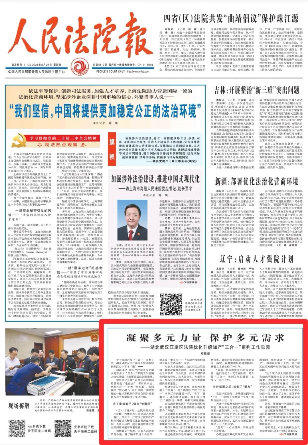 以凝聚多元力量“穿针”,于满足知识产权司法保护多元需求处“引线”,江岸区法院升级知识产权“三合一”审判工作的“针脚”越织越密。“我们还会进一步升级,让审判更精准、共治更有效。”苏江说道。