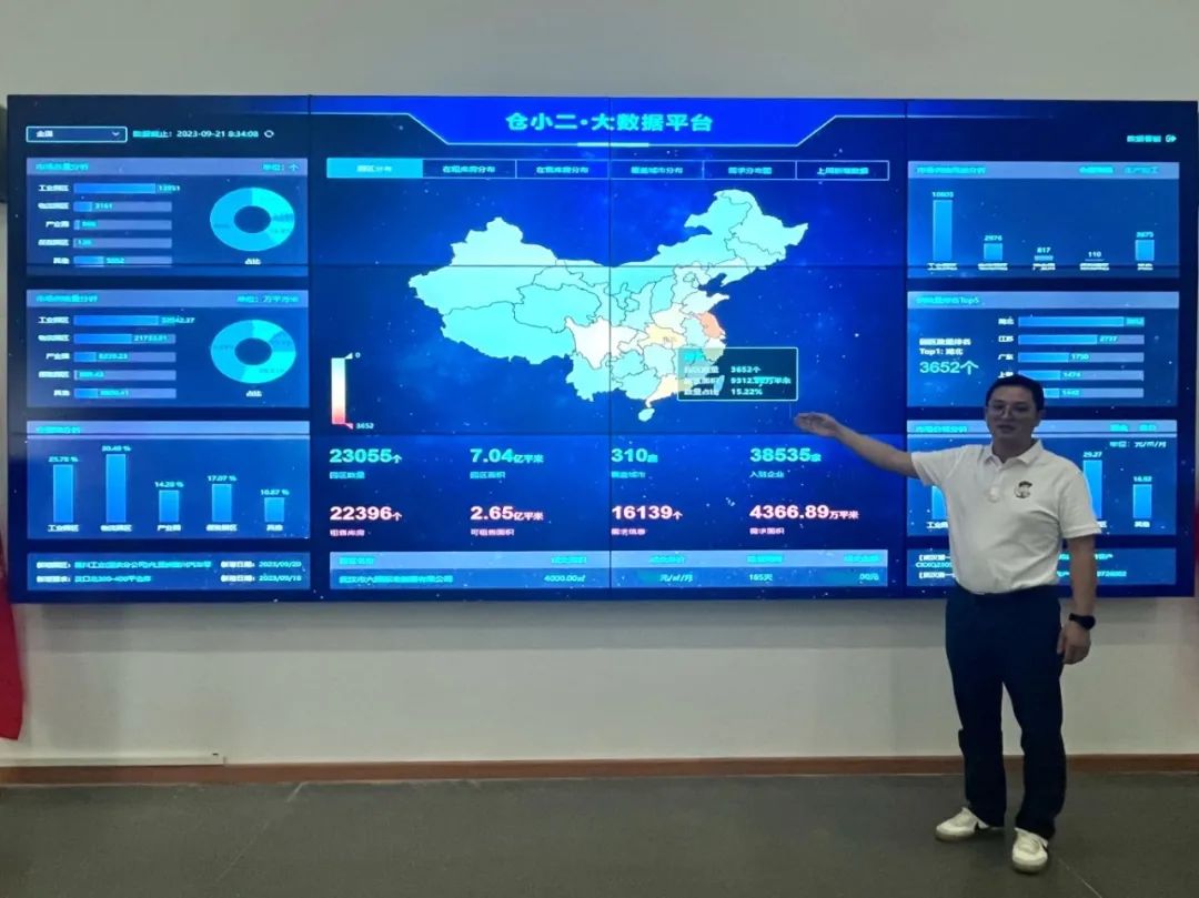 在位于武汉仓小二科技有限公司大厅的显示屏上,一张中国仓库分布地图里,约有一半的城市亮着黄色灯光,屏幕下方的数据不停滚动更新,实时显示着租赁成交数据,这是仓小二研发的仓库厂房大数据平台。