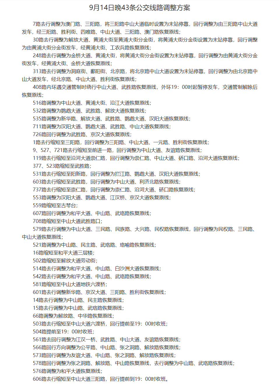 (一)交通管制期间临时调整公交线路43条(详见附表),管制结束后恢复: