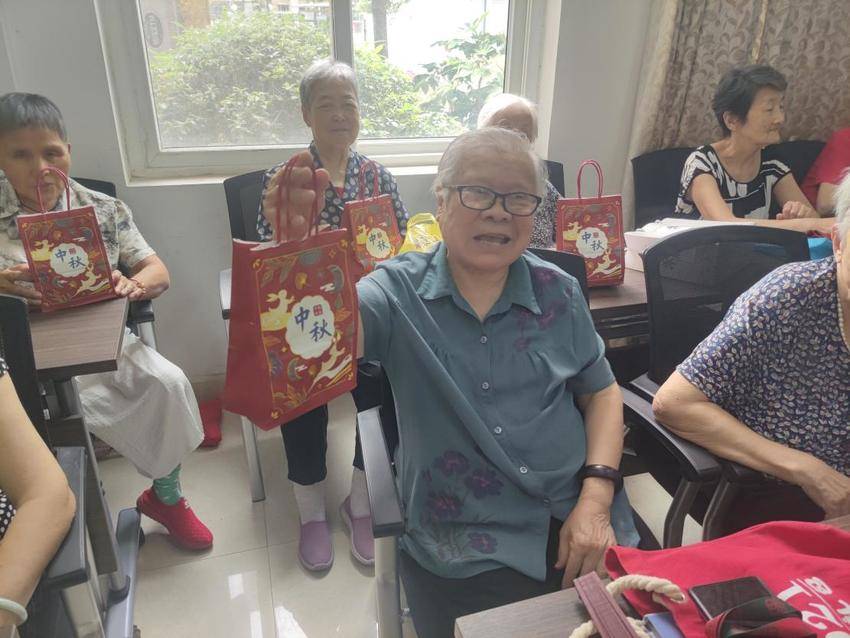 表演过程中,志愿者们和福利院领导共同为在场的爷爷奶奶送上了中秋节日福袋,让老人们既感动又欣慰。