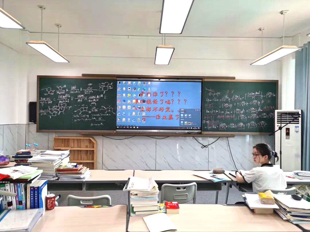 走进了竞赛小组训练的地方——两间明亮宽敞的教室,分别坐着高二和高三年级的化学竞赛生,几乎每张桌子上都堆着《有机化学》《无机化学》等大学教材。教室里,学生们非常投入地看书、演算……各自安静地学习着。教室前方的黑板上,密密麻麻地写满了各种演算过程。