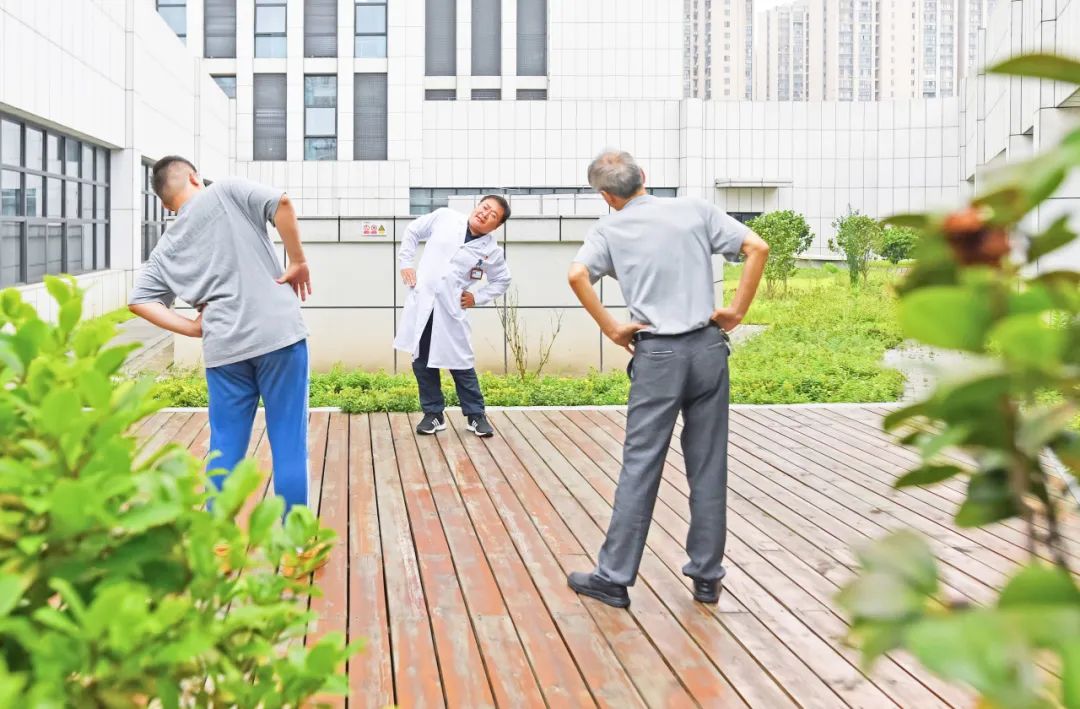 ■ 康复医学科主任医师张伟带领患者在花园阳台做康复操。
