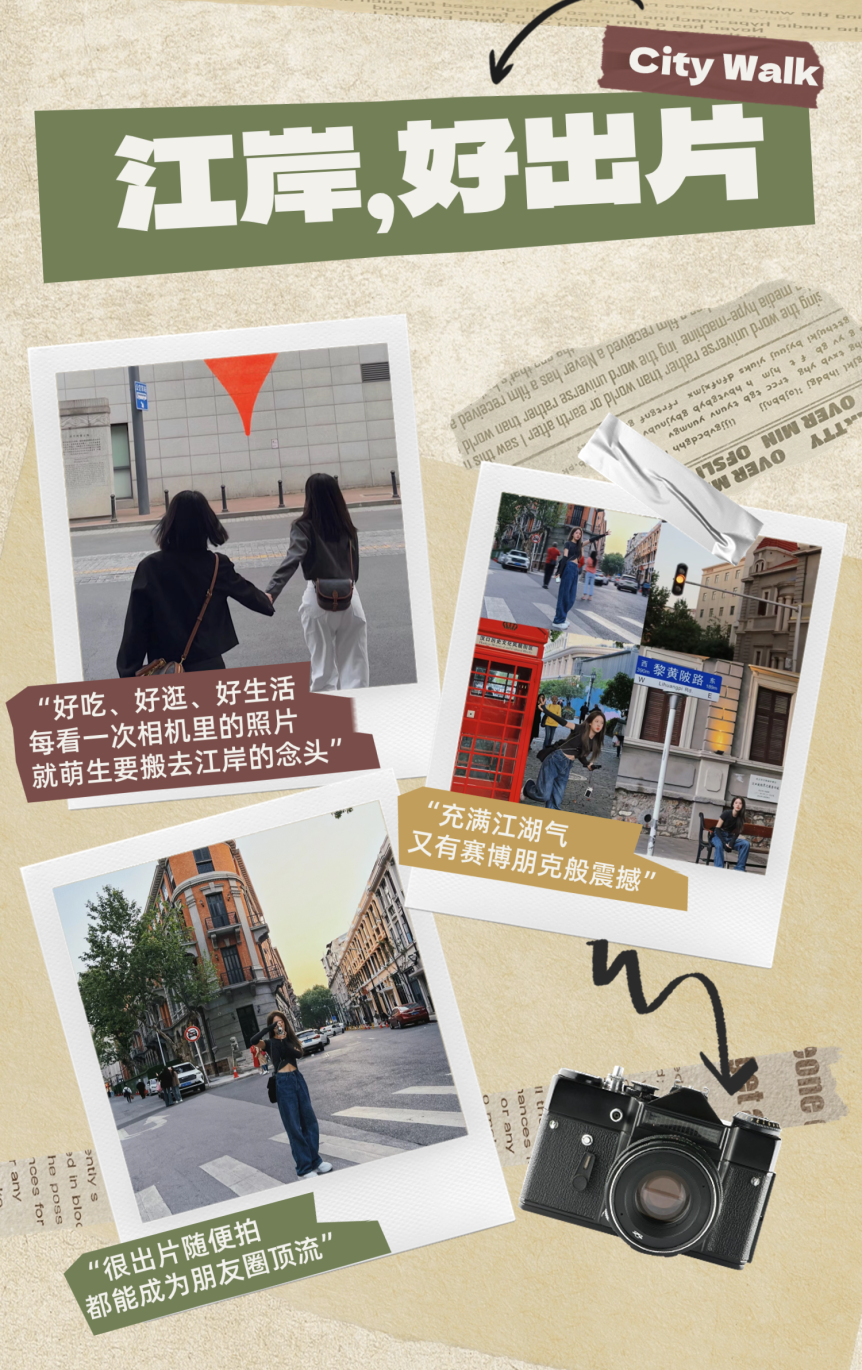 打卡江岸,《人生大事》《十日游戏》《最好的我们》《全城通缉》……把江岸浓郁的生活气和复古味推“出圈”,影迷专门制作地标地图,只为在经典取景地拍照打卡。