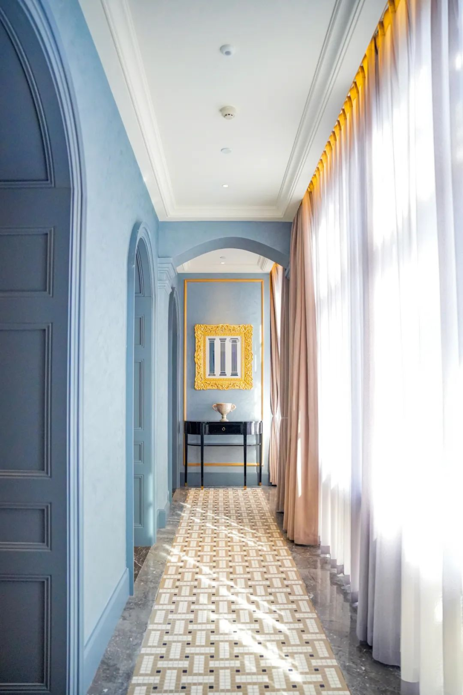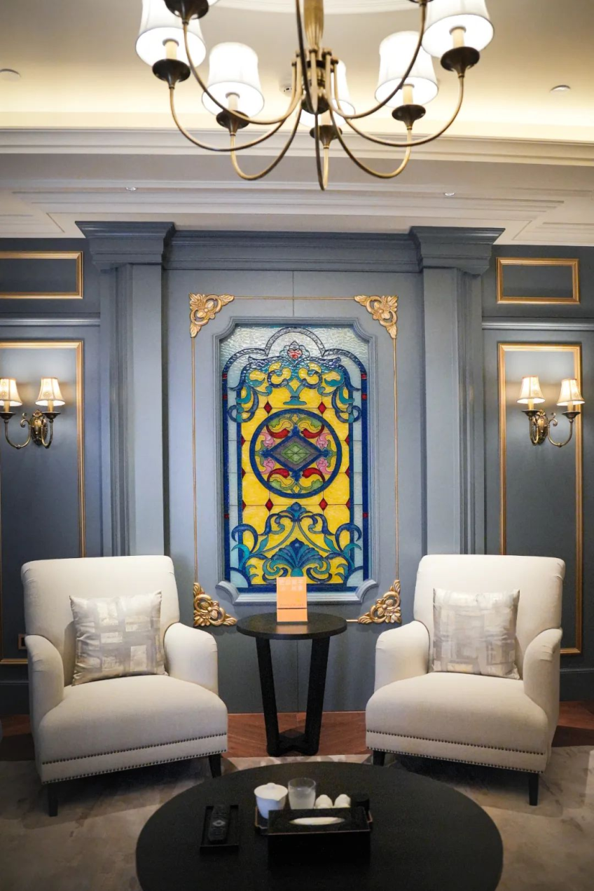 酒店内充满着浓郁的摩登范儿,大理石花砖、雕花拱形门、水晶吊灯……让人感觉宛如重返老汉口,沉浸感十足。
