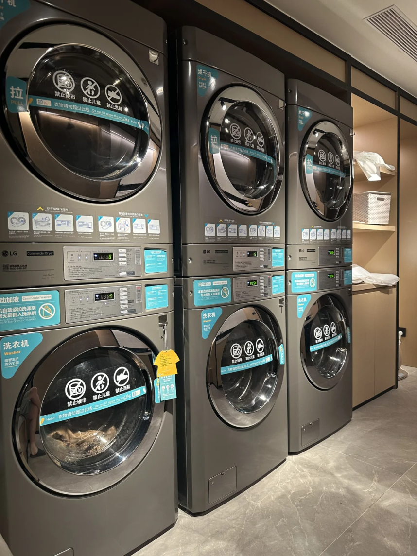 以华住集团为例,旗下全季酒店、汉庭酒店、你好酒店的最新门店里均设有业内顶配的LG商用洗烘机设备。