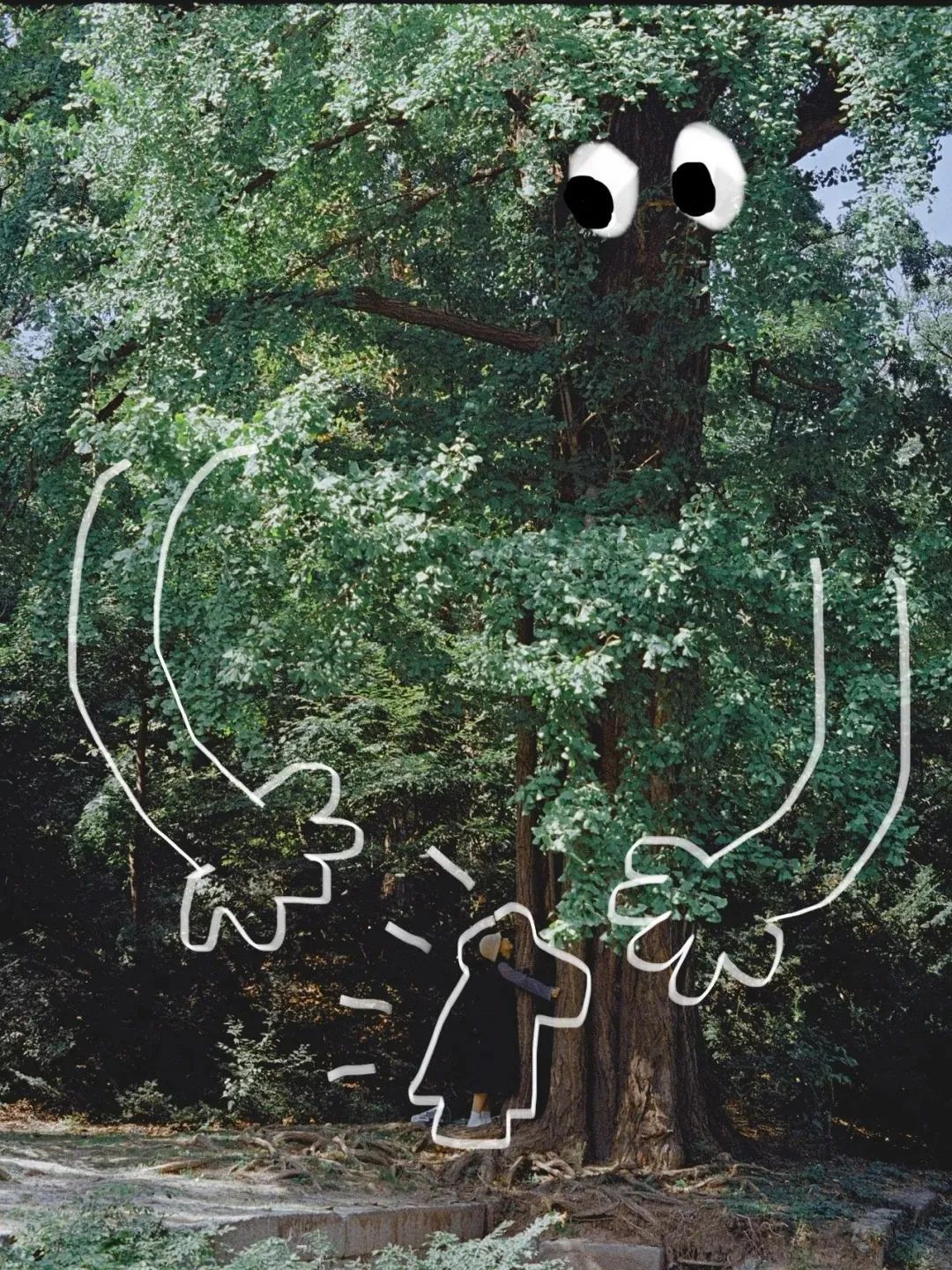 将整个身体贴住树干,静下来感受自己的呼吸和心跳声,然后自由地表达内心感受。