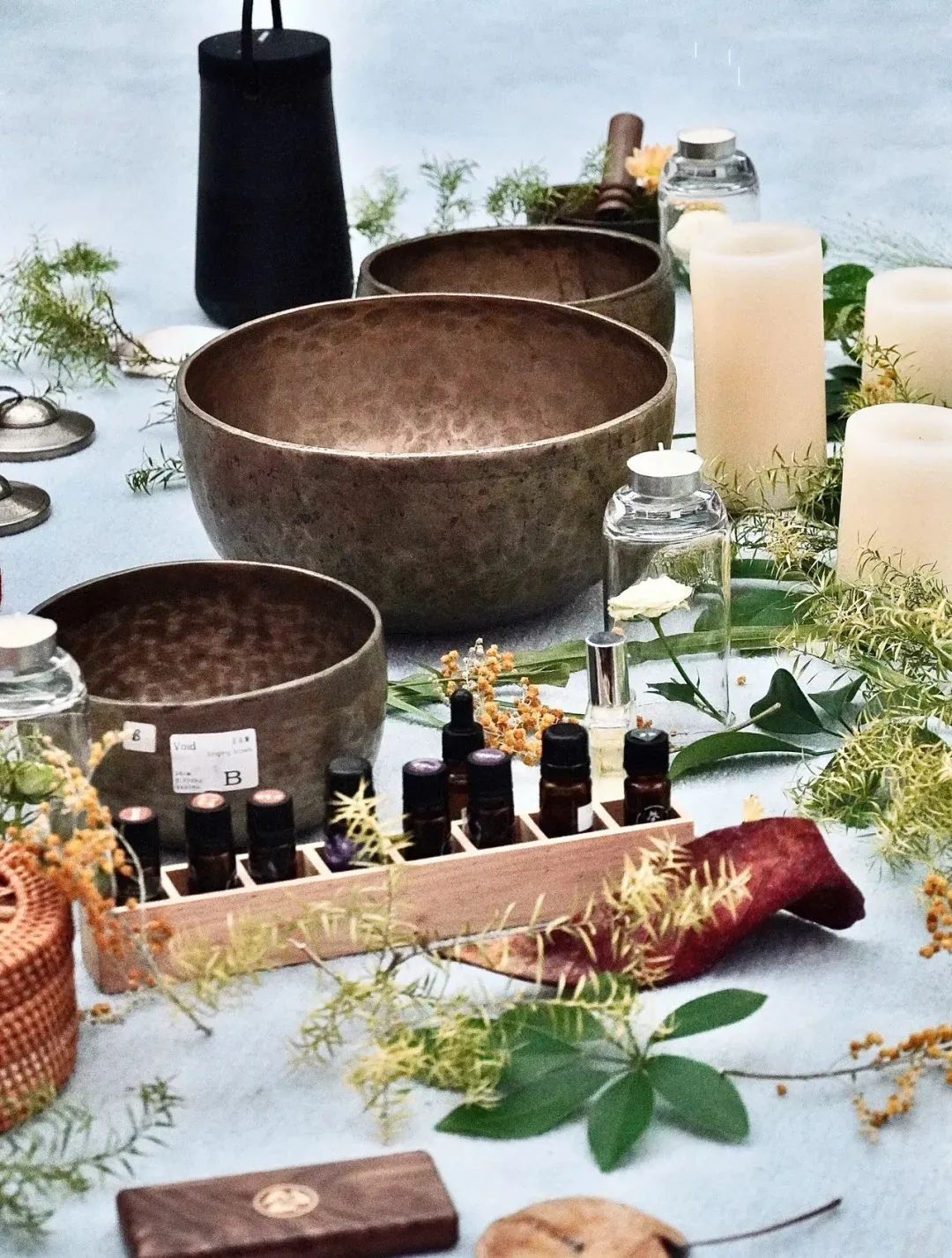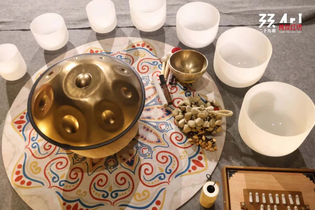 疗愈师轻轻敲击或摩擦手碟、颂钵、果实摇铃等乐器产生的声音和振动,创造出一个空灵奇幻的音乐空间。