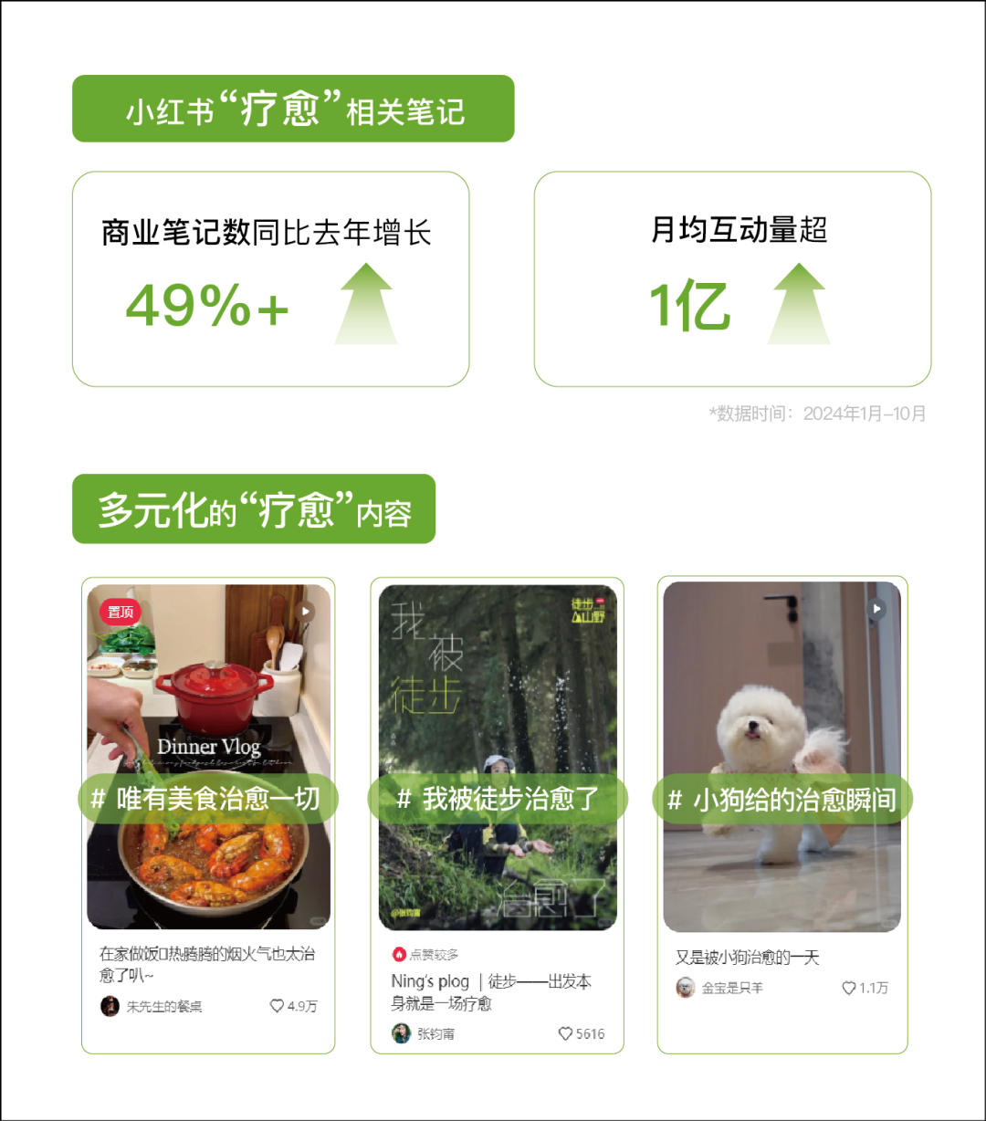 千瓜数据显示,截至2024年10月,社交平台小红书“疗愈”相关笔记数同比增长49%,月均互动量超1亿。