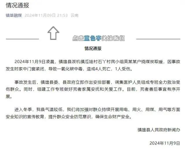 11月9日,云南省镇雄县泼机镇瓜娃村发生一起烧煤取暖导致的一氧化碳中毒事件,事故造成4人死亡。据死者亲属王女士表示,事发家中门窗紧闭,当时一共有五人在家。事故造成其外婆、幺舅及侄儿侄女死亡,他们烧火时忘记盖炉子的盖子,加之门窗紧闭造成中毒,侄女才4岁多,侄儿3岁多。