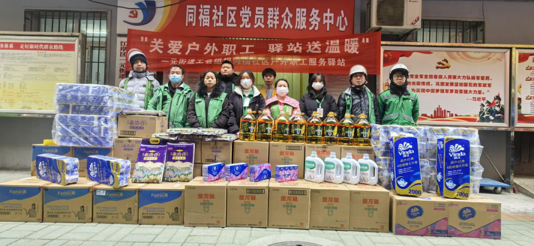 一元街道同福社区开展“关爱户外职工 驿站送温暖”活动。为中国邮政上海路揽投站、朴朴超市等公司的户外职工准备米、油、纸巾等生活物资,为新业态群体送去关爱及节日祝福。