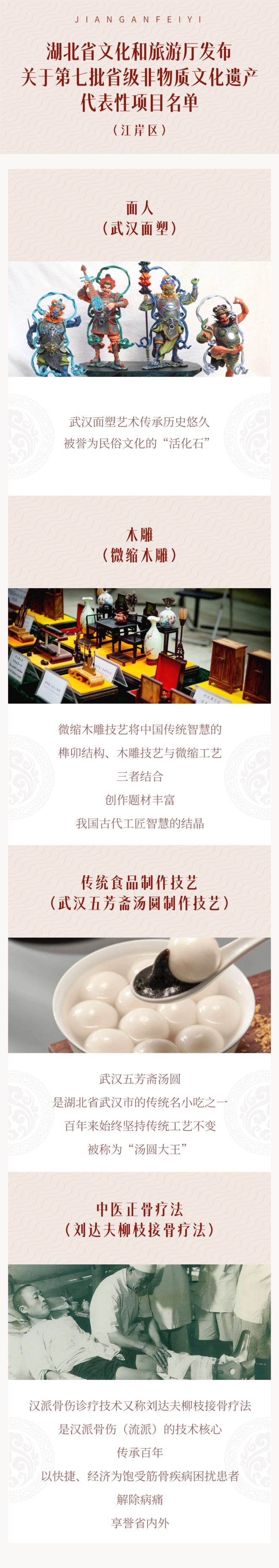 目前,江岸区拥有各级非遗代表性项目34项,其中国家级1项、省级13项。各级非遗代表性传承人53人,其中省级8人,传承人群逾百人,构建了较为完整的非遗项目名录和传承人体系。