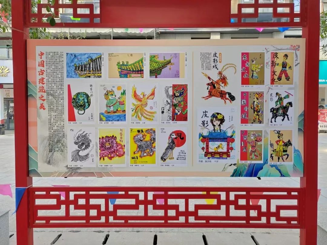 百步亭社区现代城新时代文明实践广场青少年艺术长廊展出“童心同绘筑梦美好 同心聚力共同缔造”主题非遗书画展。210件现代城“小小楼栋长”及青少年志愿者创作的作品,吸引众多居民驻足观展。