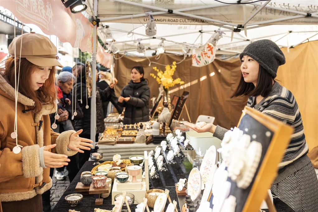 1月5日,周末暖阳下,黎黄陂路人头攒动。喧闹的市集中,一缕缕或浓郁或冷冽的香气不时传来,引得许多市民、游客在街口摆满香氛产品的摊位上驻足品香。