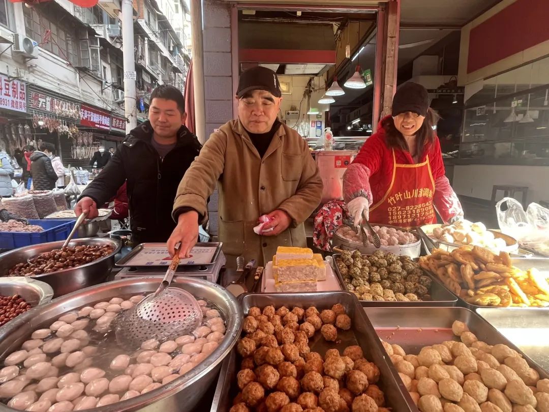 老板张连志和妻子麻利地夹圆子、称重、蒸圆子,在狭小摊位里“转”个不停。他家的圆子不仅是街坊们年饭桌上的必上菜,还被邮寄到北上广杭和美国、新加坡、日本等地,让春节在外汉口伢一慰乡愁。