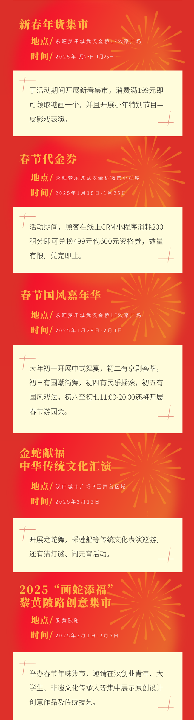 同时,国家级旅游休闲街区黎黄陂路也将在过年期间连续举办2025“画蛇添福”创意集市,邀请在汉创业青年、大学生、非遗文化传承人等集中展示原创设计创意作品及传统技艺。