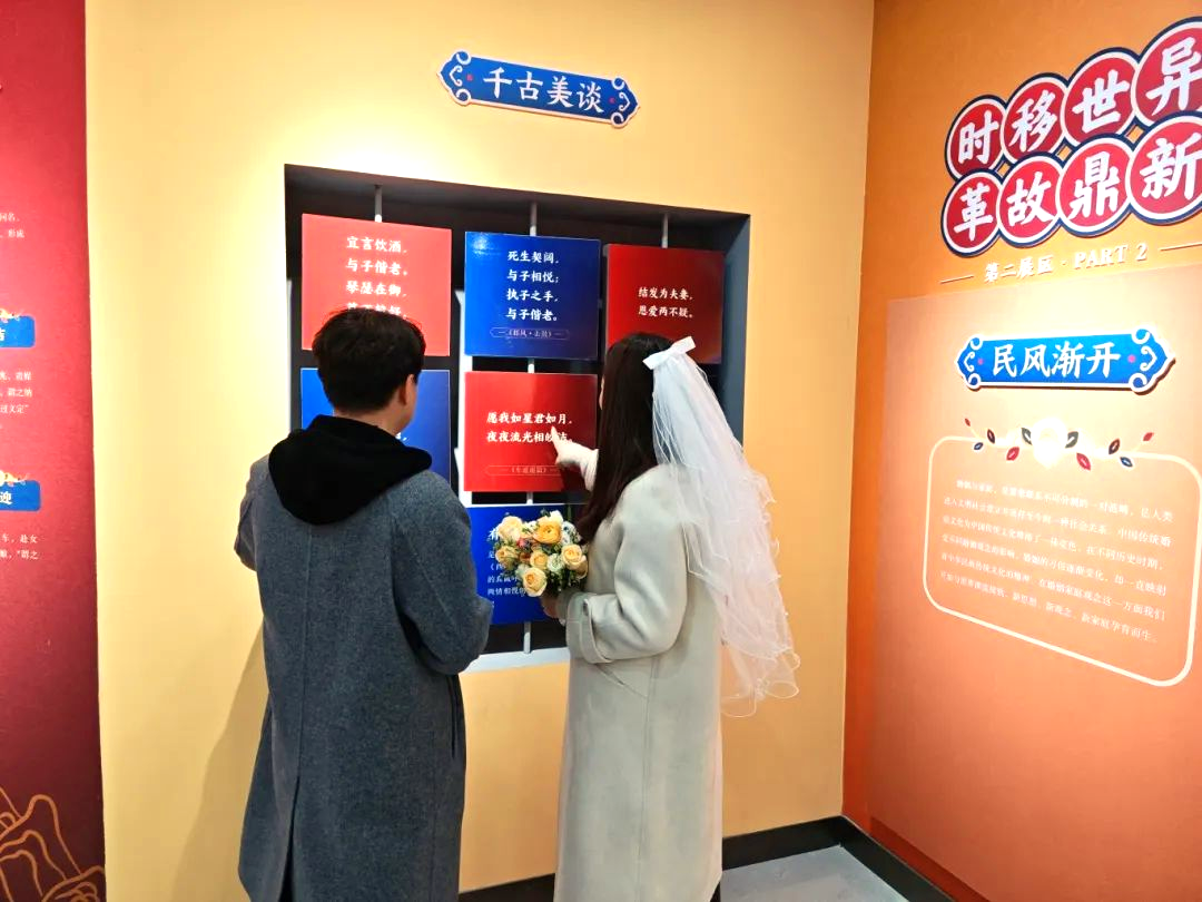 一楼的婚俗文化馆展示着与婚俗文化相关的图片、文字和实物,生动再现了传统婚俗的仪式与风情,让人仿佛穿越时空,感受传统文化的深厚底蕴与新时代婚姻的多样魅力。二楼颁证厅内,则为新人打造的浪漫拍照打卡点,成为新人们的“甜蜜圣地”。